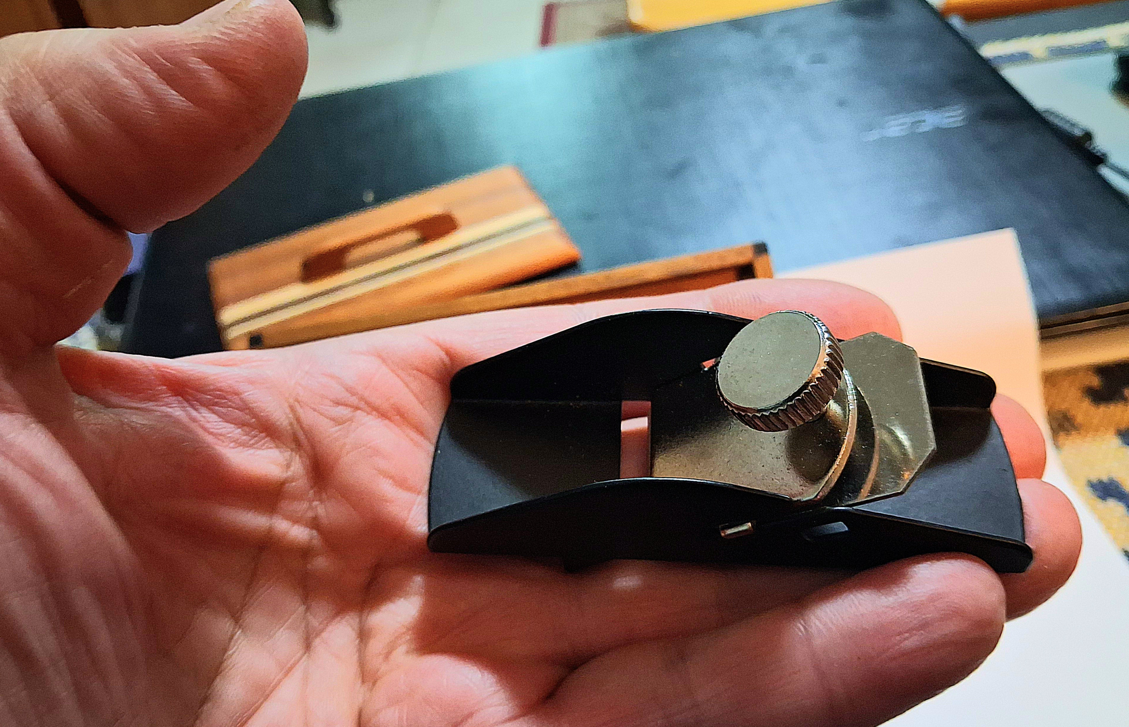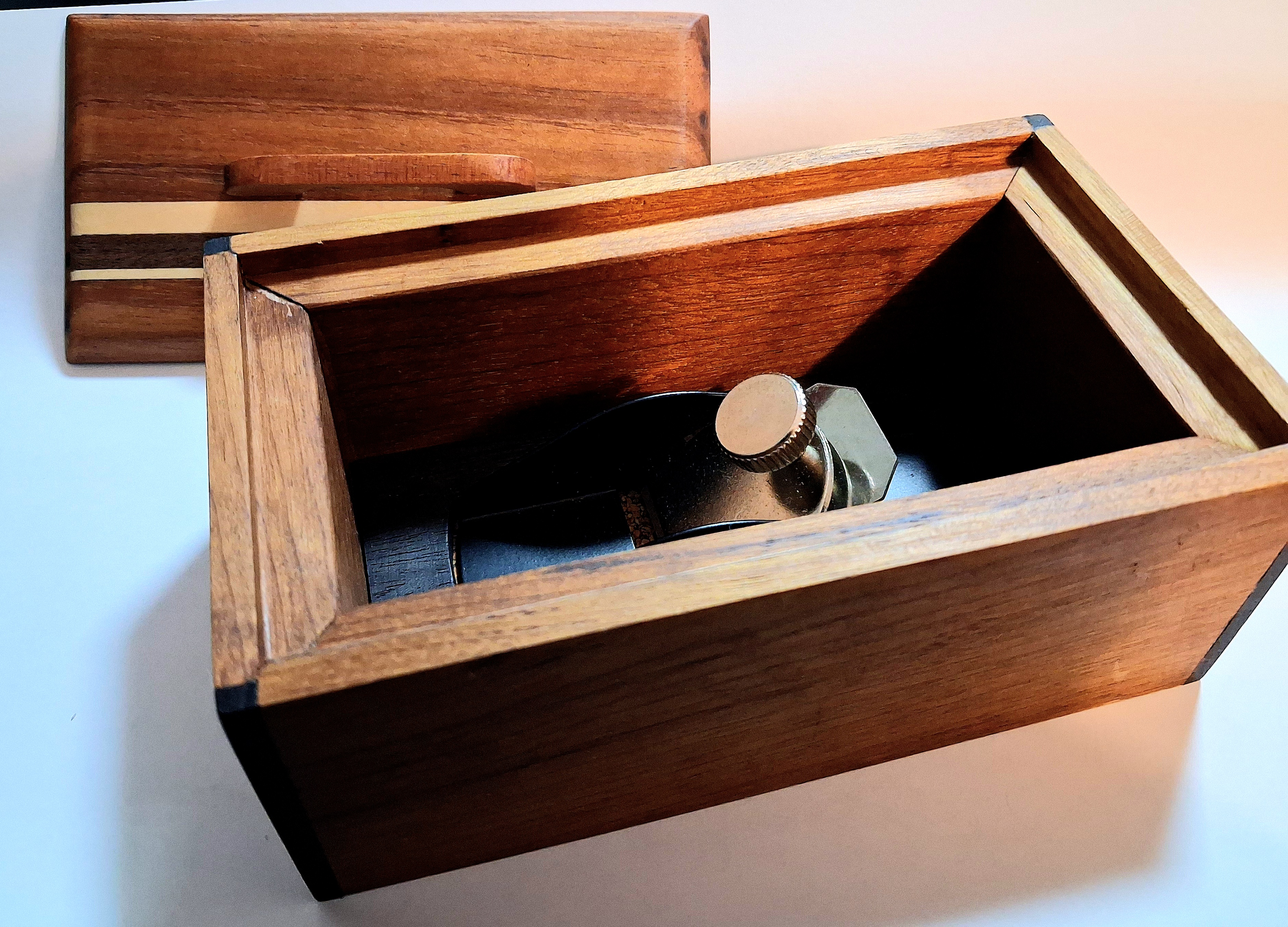For his birthday, I imported a miniature hand plane (only 90mm long) and build a custom wooden box for it – mainly from kiaat with lid inlays of American Walnut and Spruce. The base has a cork lining to protect the exposed cutting surface of the blade. Hopefully it will become an heirloom for his only grandson.