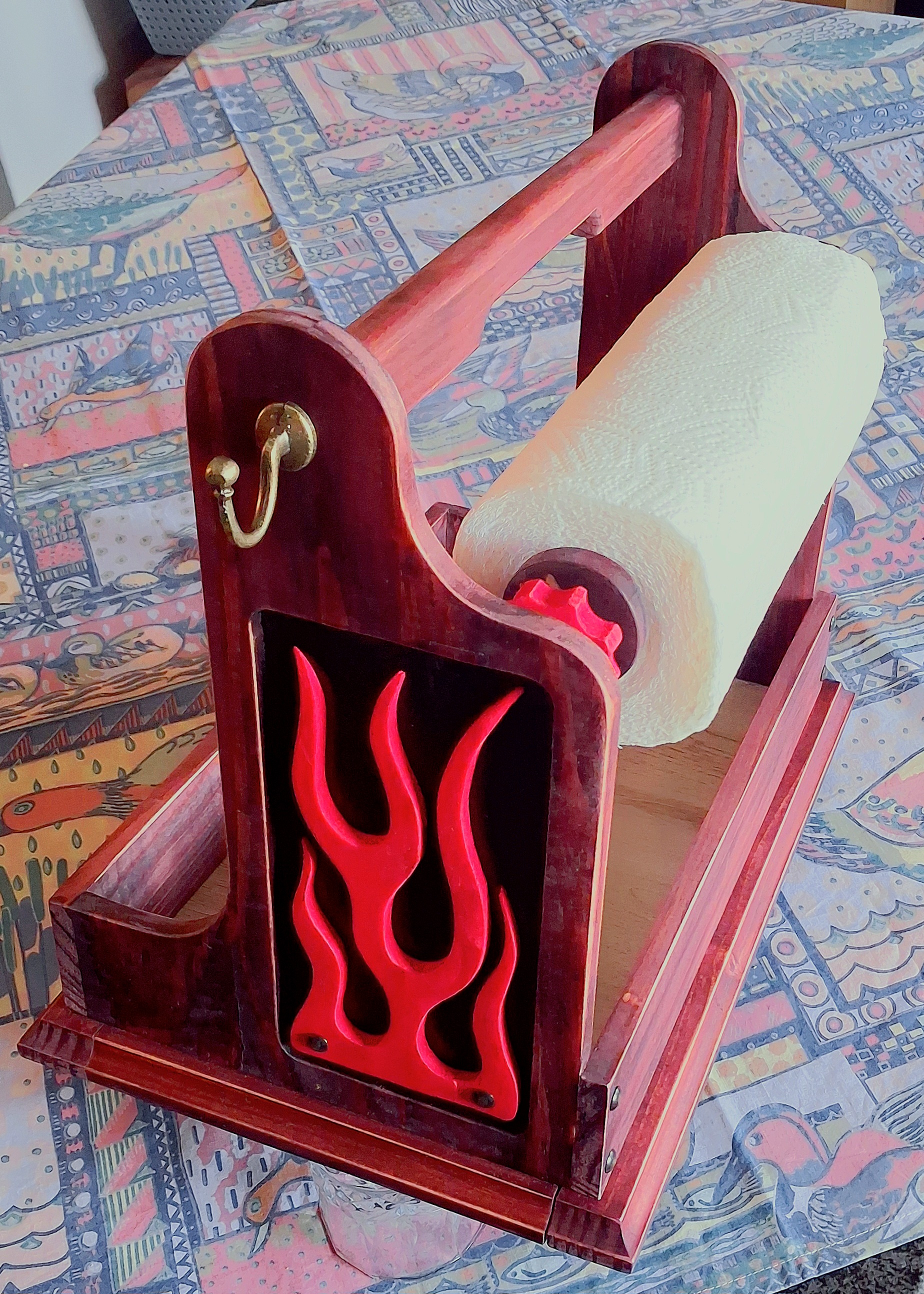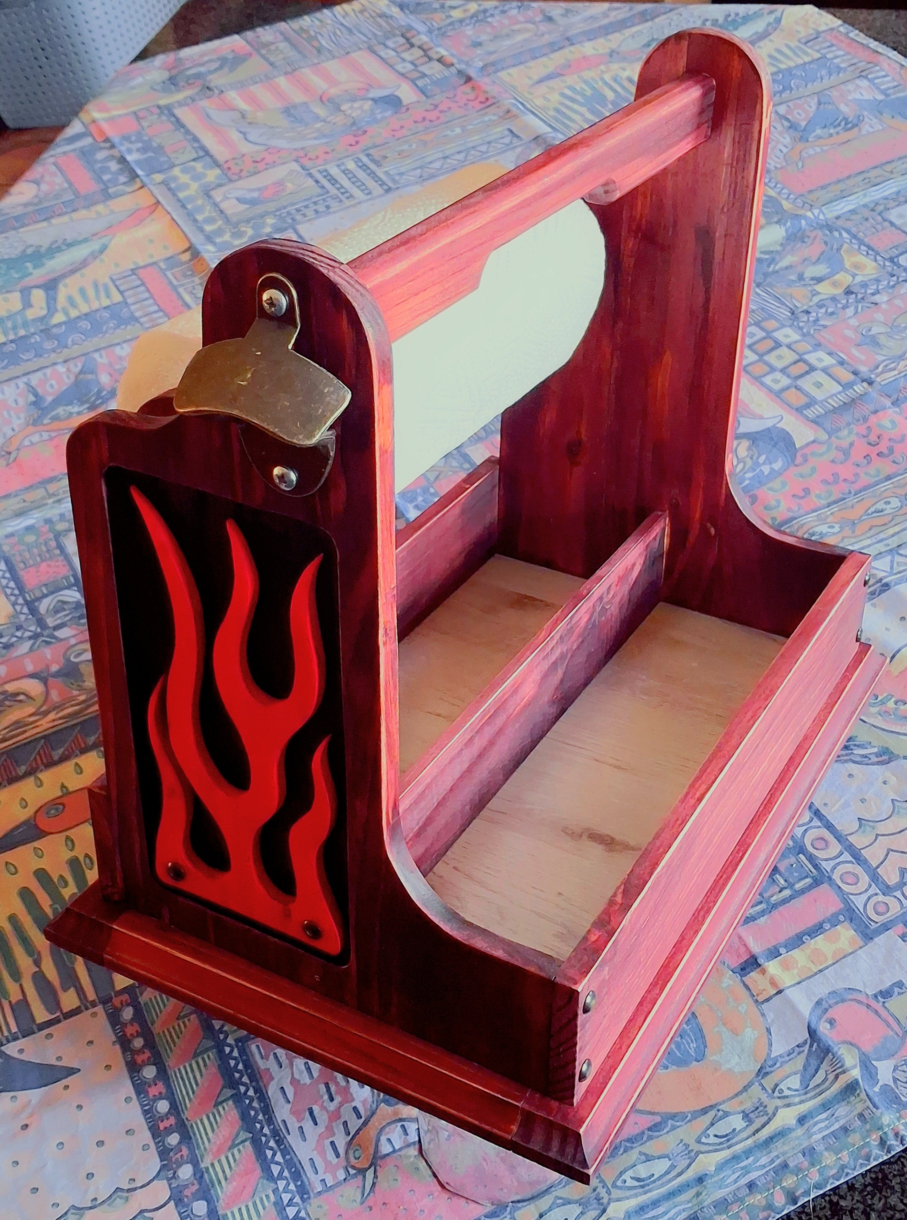 Braai caddy for a friend’s birthday, featuring space for your spices, marinades, etc, paper towel roller, Old Skool bottle opener on the left side and a hook on the right side for your oven glove.