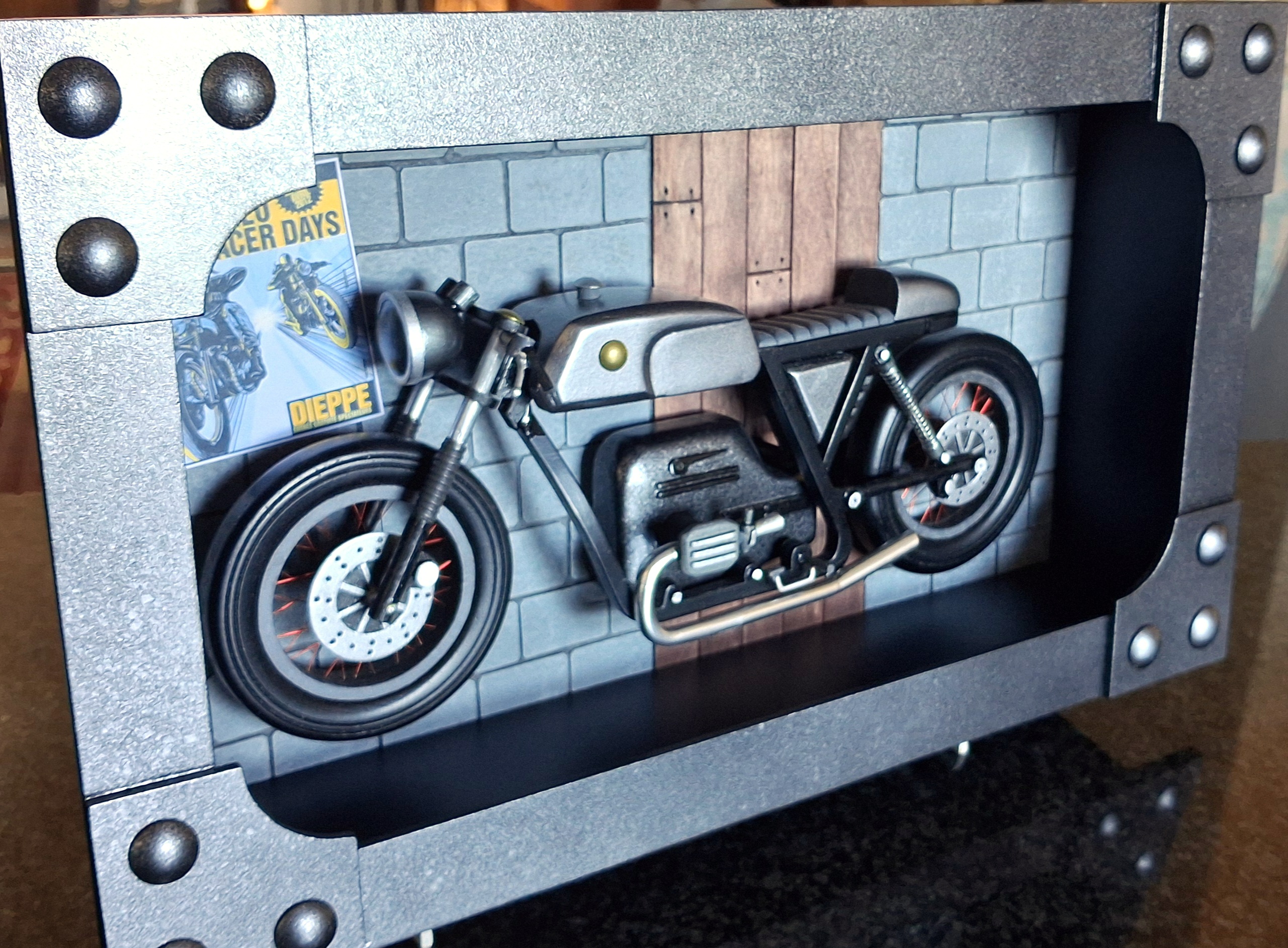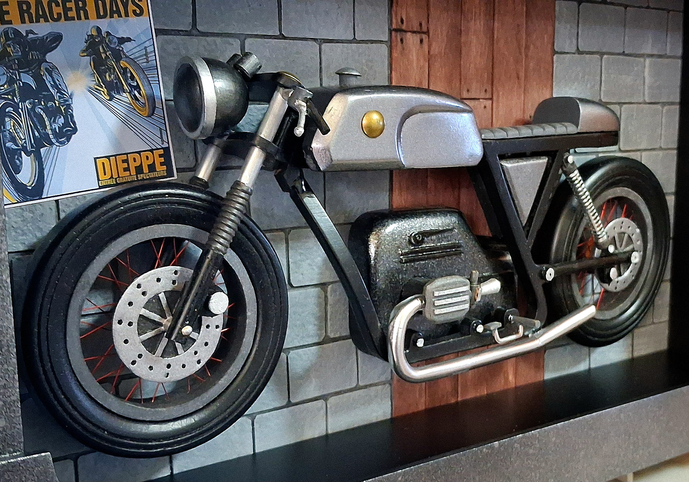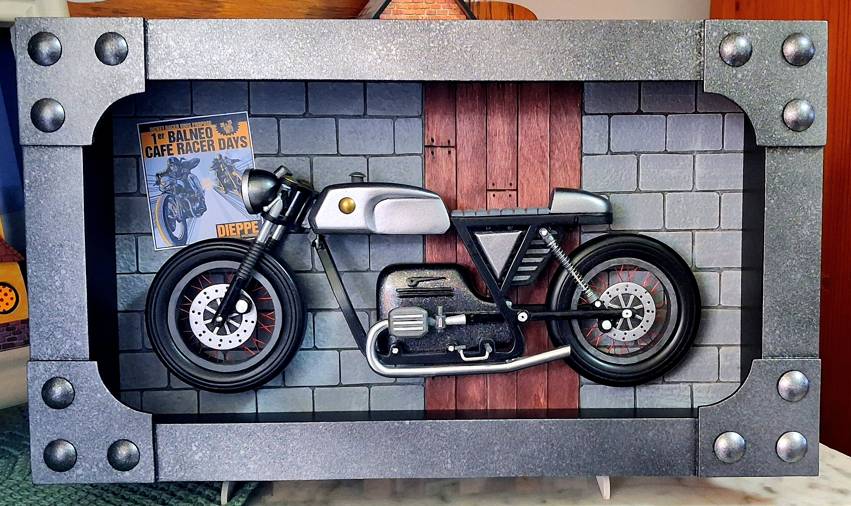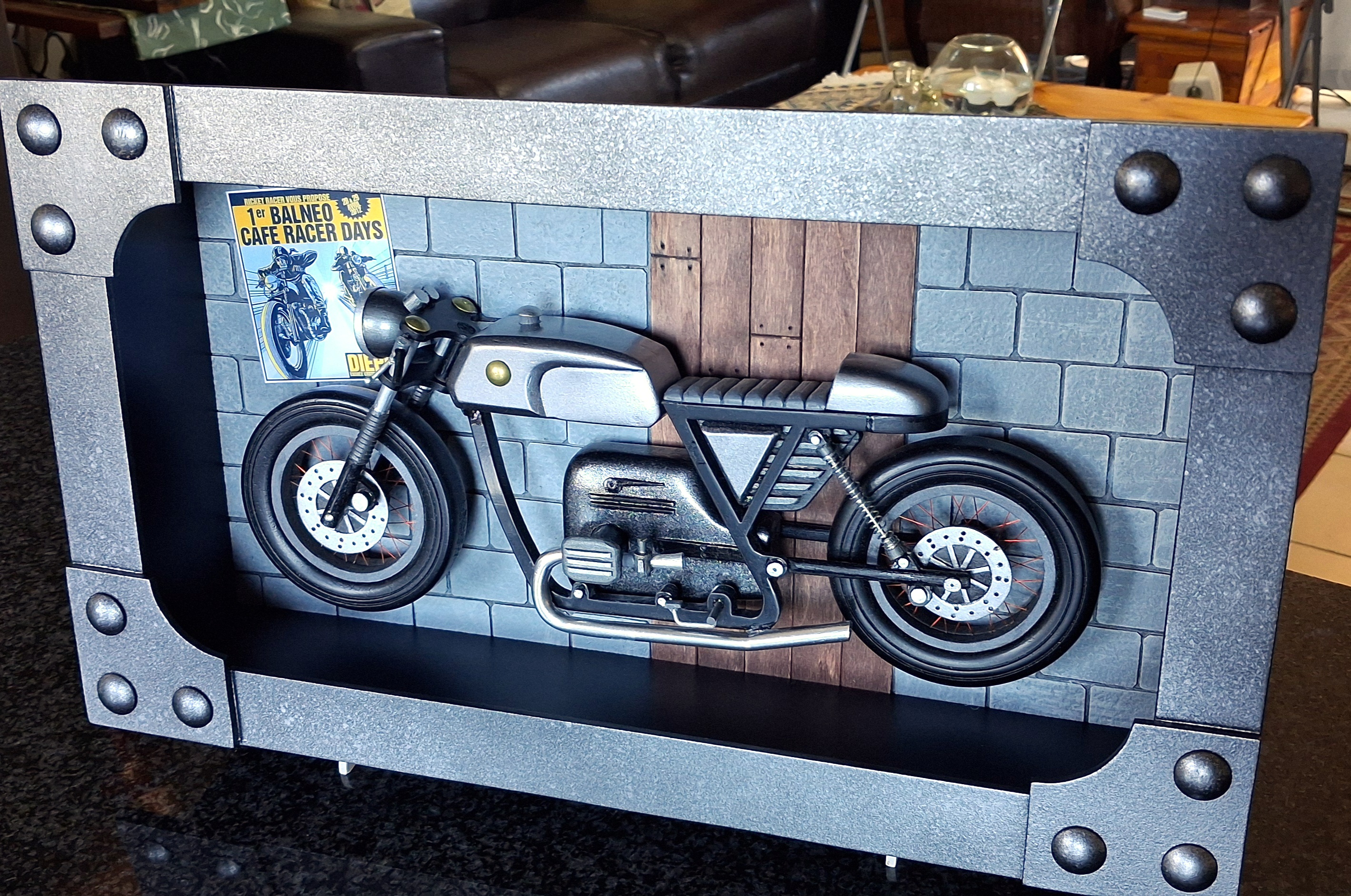 BMW Cafe Racer “object d’art” built for a friend who rides BMWs. The bike is around 1:8th or 1:9th scale and about 26cm long. It is made entirely of wood, with the exception of the wire spokes, rear spring and the rivets on the box frame.