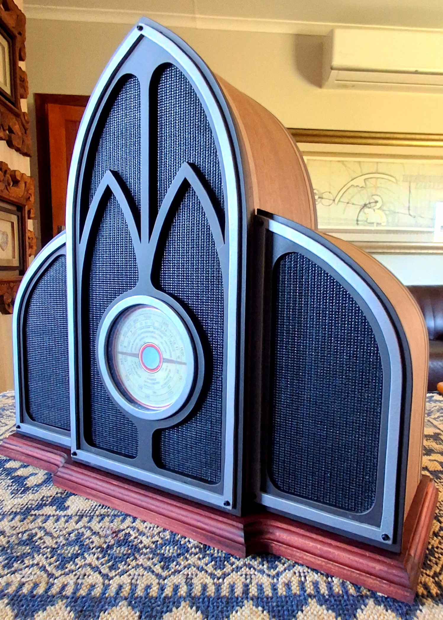 We play the music in our bedroom through a bass box and two small speakers. Effective, but not much to look at. We needed a more elegant housing… something with a vintage radio feel.