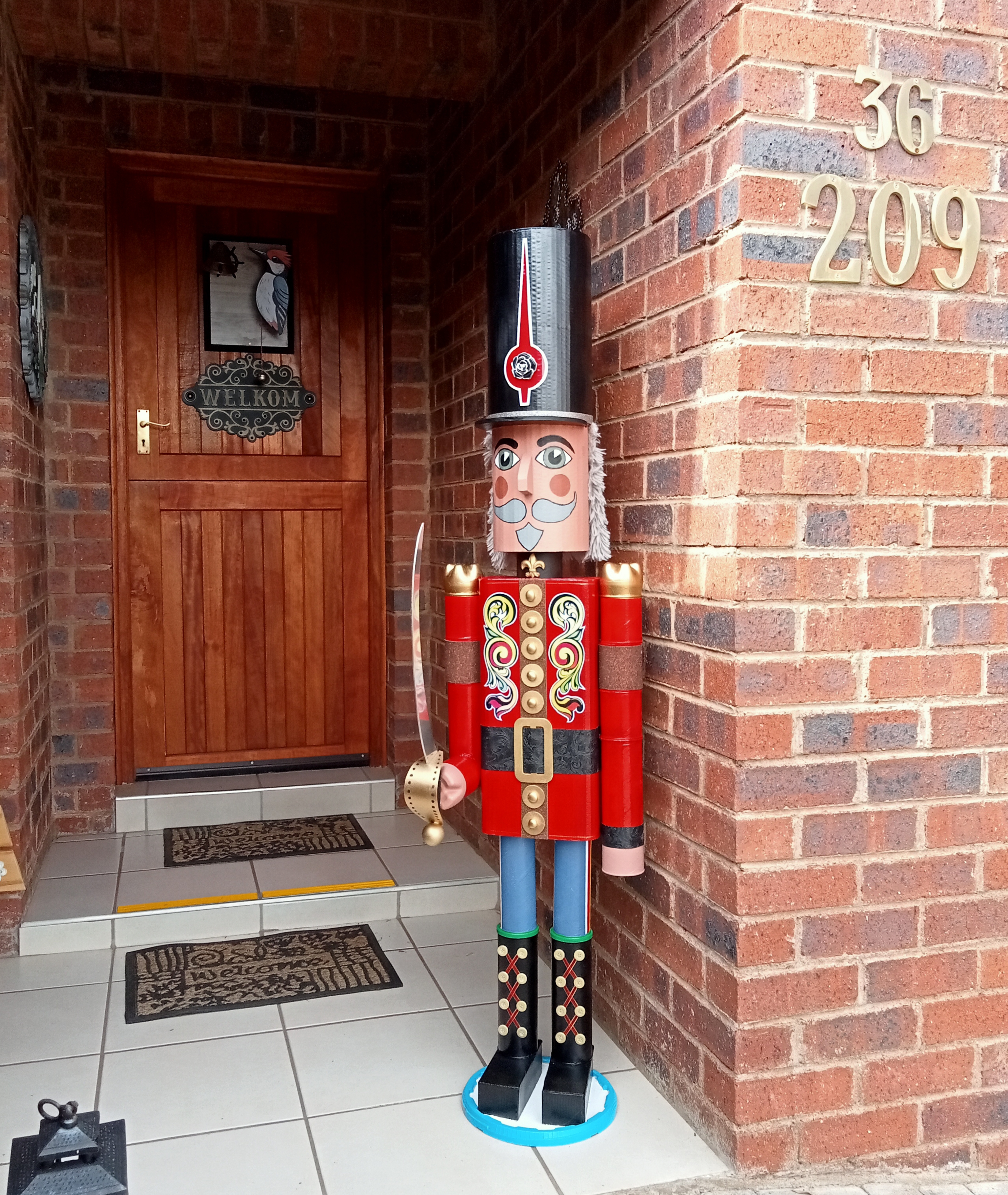 Nutcracker soldier made from scrap cardboard for the 2024 Festive season. Around one metre tall.